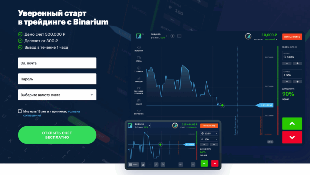 Трейдинг на Binarium не гарантирует прибыли и сопряжен с рисками, характерными для бинарных опционов.