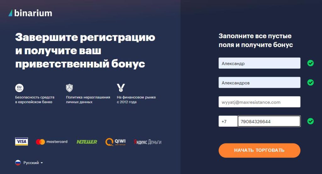Пополнение счета на Binarium занимает несколько минут и выполняется через удобные платежные системы.