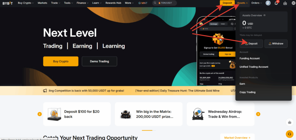Главный экран Bybit с меню Assets