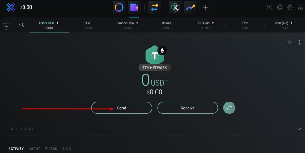 Экран выбранной криптовалюты с кнопками Send и Receive