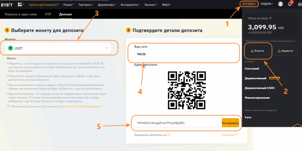 Адрес депозита на Bybit с кнопкой Copy