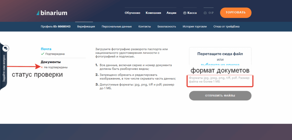 - Подтверждение контактных данных. Иногда Binarium просит короткое видео, на котором держат документ у лица, либо фото, если возникает подозрение на фальшивку.