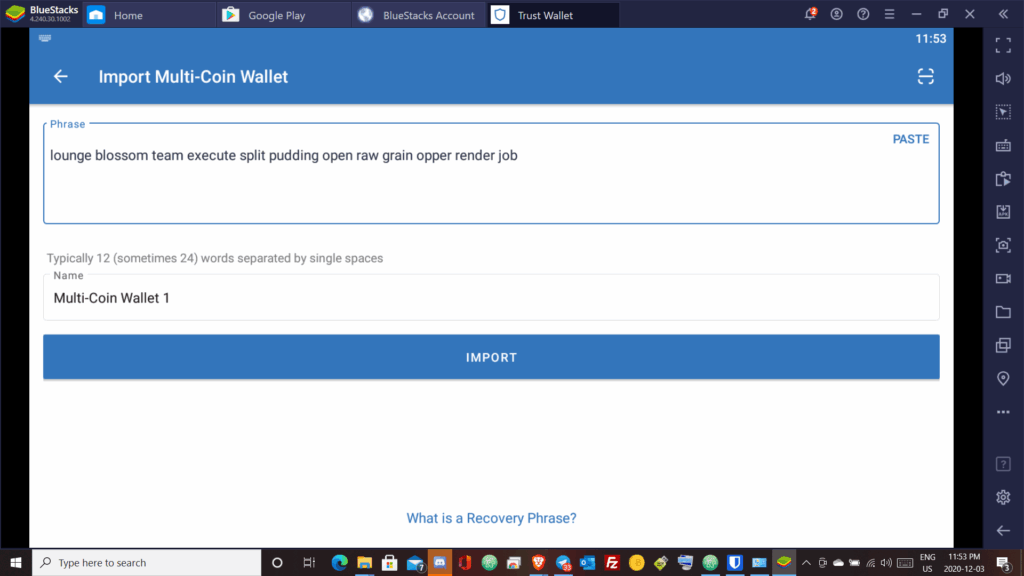 Экран Trust Wallet с опцией импорта и полем для seed-фразы